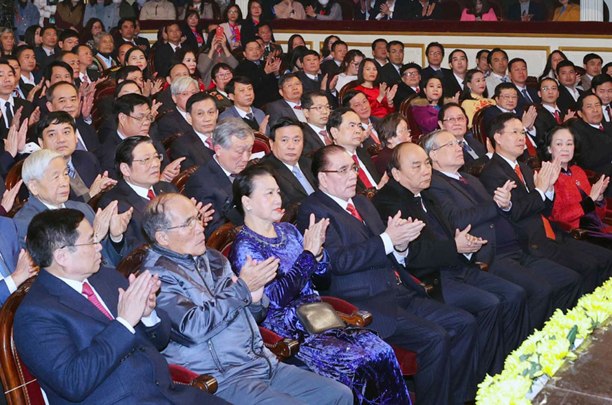 Thủ tướng Nguyễn Xuân Phúc, Chủ tịch Quốc hội Nguyễn Thị Kim Ngân, Thường trực Ban Bí thư Trần Quốc Vượng cùng các đồng chí lãnh đạo, nguyên lãnh đạo Đảng và Nhà nước tham dự buổi lễ.