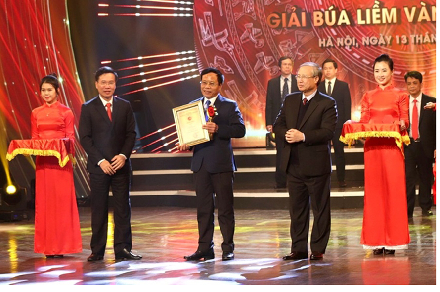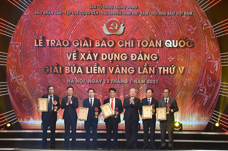 Đồng chí Trần Quốc Vượng, Ủy viên Bộ Chính trị, Thường trực Ban Bí thư và đồng chí Võ Văn Thưởng, Ủy viên Bộ Chính trị, Bí thư Trung ương Đảng, Trưởng Ban Tuyên giáo Trung ương trao giải A cho tác giả Nguyễn Văn Minh Báo điện tử Đảng cộng sản Việt Nam. Ảnh: LT