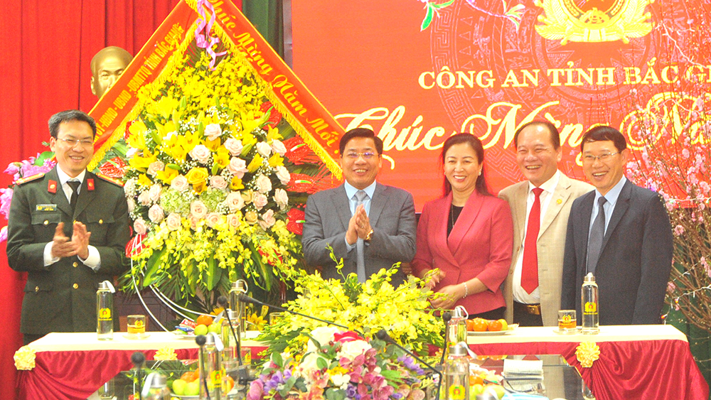 Các đồng chí Thường trực Tỉnh ủy tặng hoa chúc mừng năm mới Công an tỉnh Bắc Giang. |