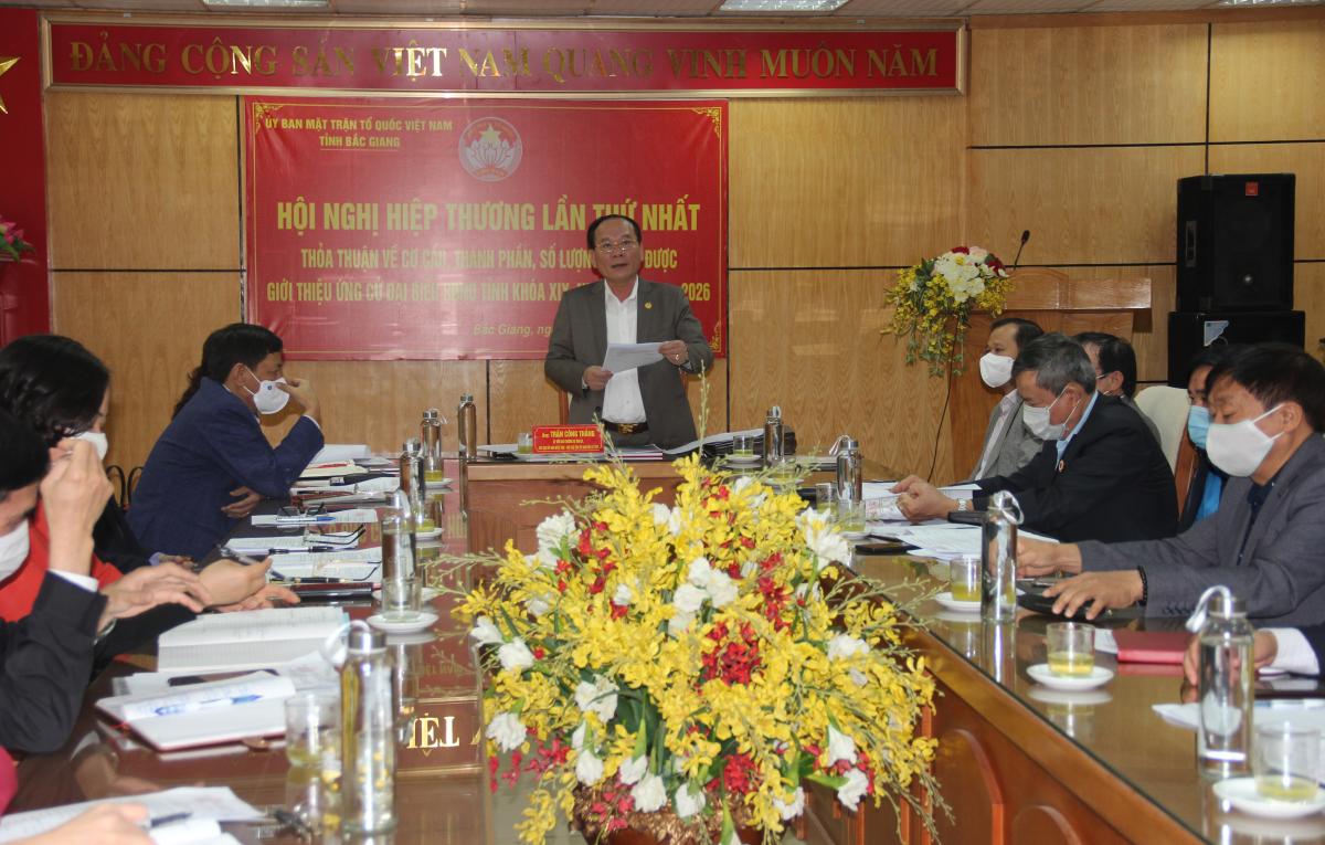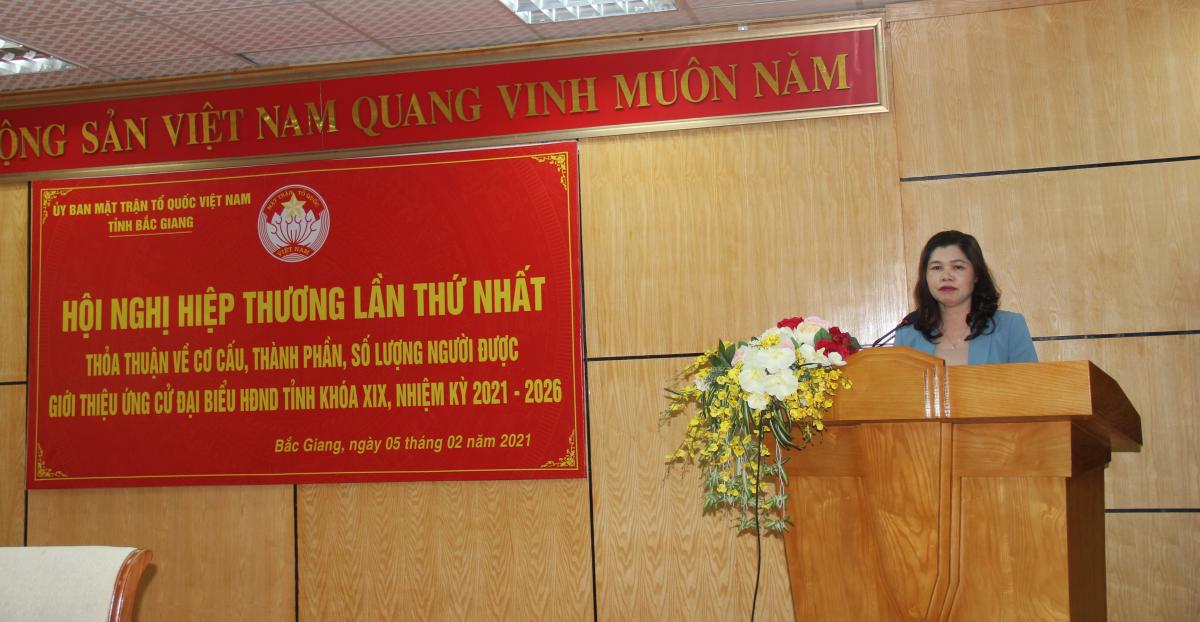 Ngày 5-2-2021, Ban Thường trực Ủy ban MTTQ tỉnh Bắc Giang tổ chức hội nghị hiệp thương lần thứ nhất để thỏa thuận về cơ cấu, thành phần, số lượng người của cơ quan, tổ chức, đơn vị giới thiệu người ứng cử đại biểu Quốc hội khóa XV và HĐND tỉnh khóa XIX, nhiệm kỳ 2021-2026.