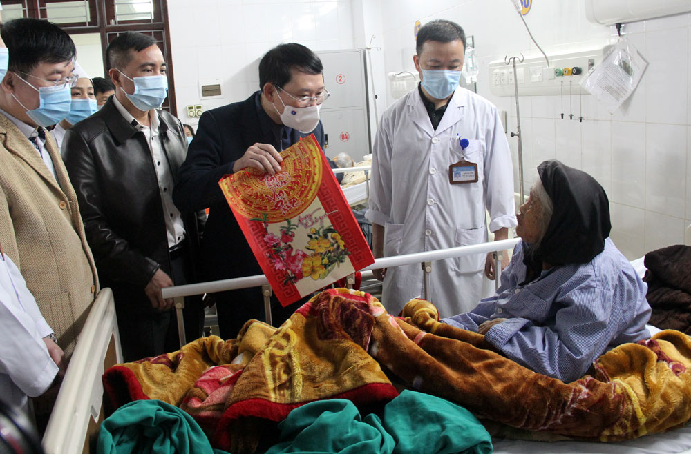 Nhân dịp này, Chủ tịch UBND tỉnh Lê Ánh Dương đến thăm hỏi, tặng quà Tết, động viên các bệnh nhân nặng điều trị tại Khoa Hồi sức tích cực và chống độc.