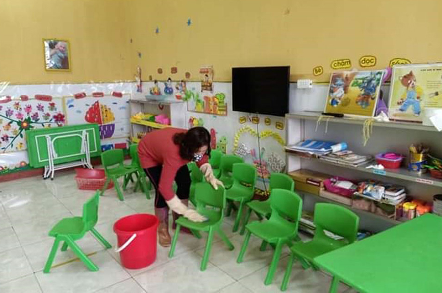 Giáo viên Trường Mầm non Bảo Đài (Lục Nam) vệ sinh khuôn viên chuẩn bị đón học sinh đi học trở lại.