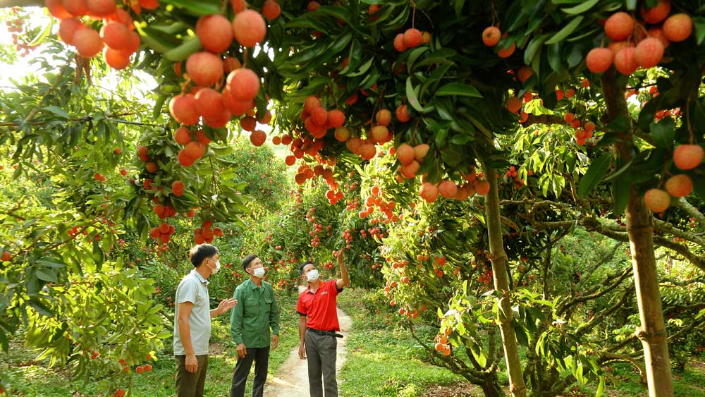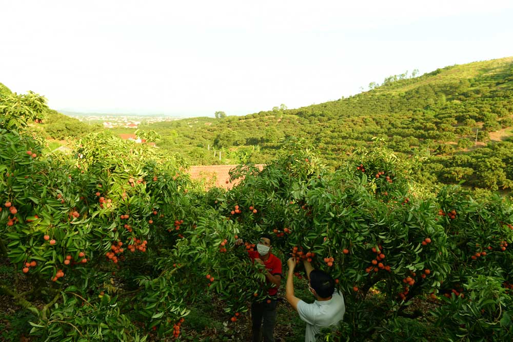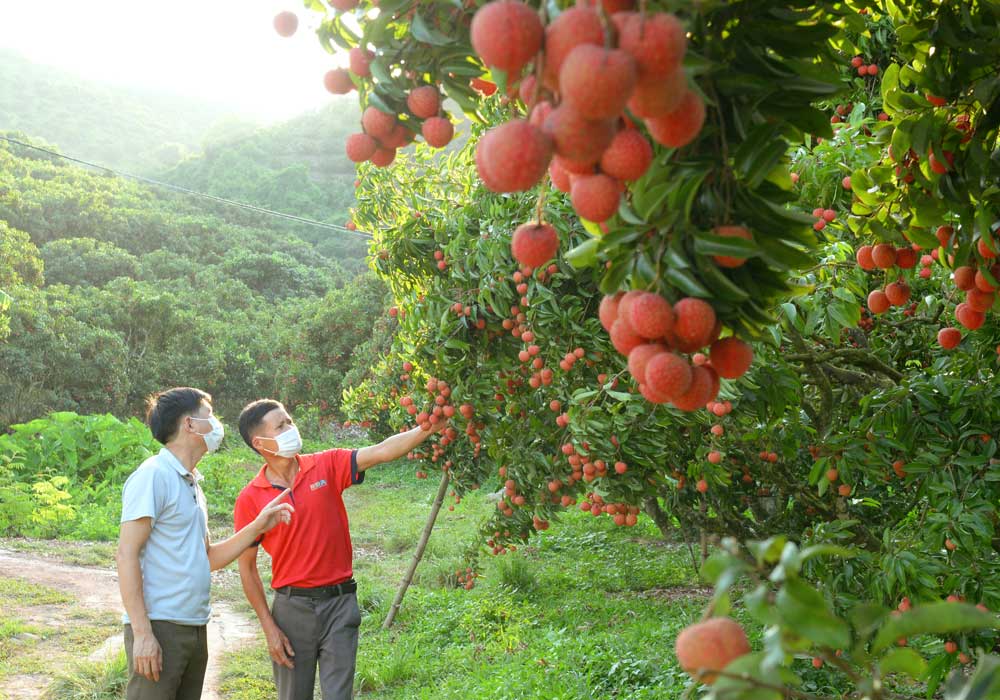 Vườn vải của hộ ông Ngô Văn Hùng (bên phải), thôn Cầu Đền được đánh giá có sản lượng cao nhất HTX, đạt gần 9 tấn/ha. Toàn bộ diện tích đều đạt chất lượng xuất khẩu sang Nhật Bản.