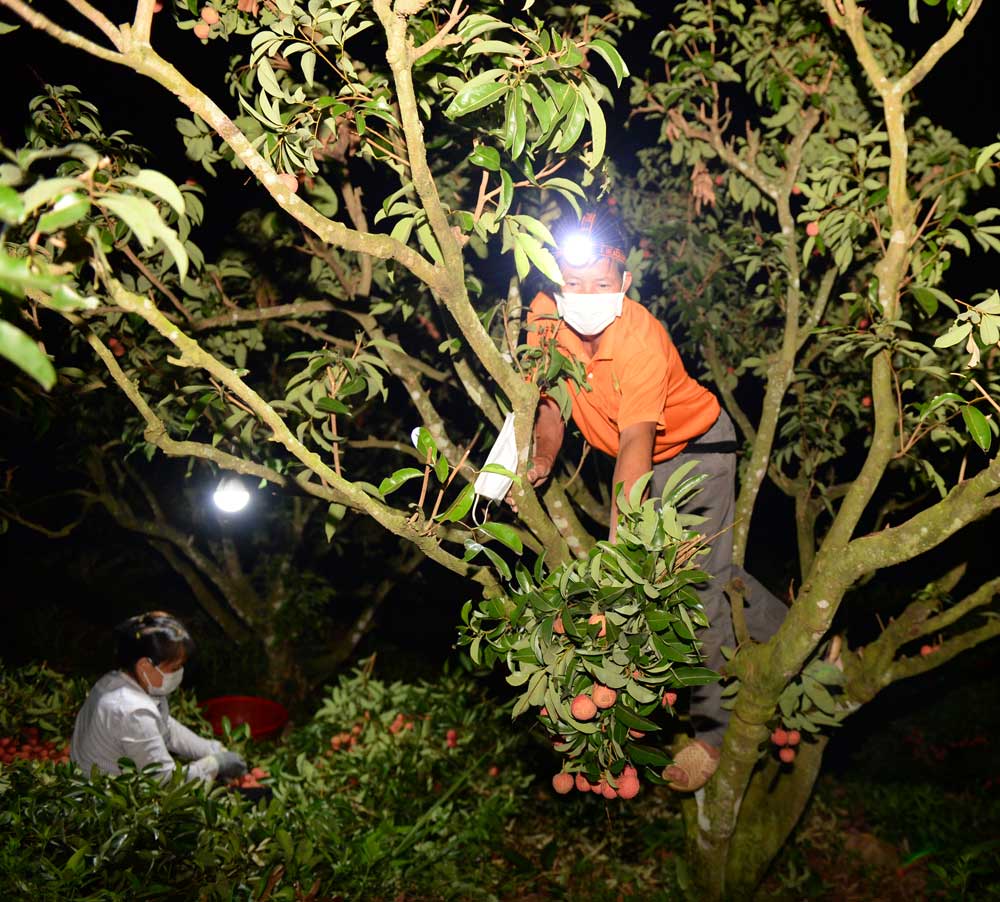 Do thiếu nhân công nên hơn 1 giờ sáng ông Hùng đã phải đi hái vải mới kịp giao cho