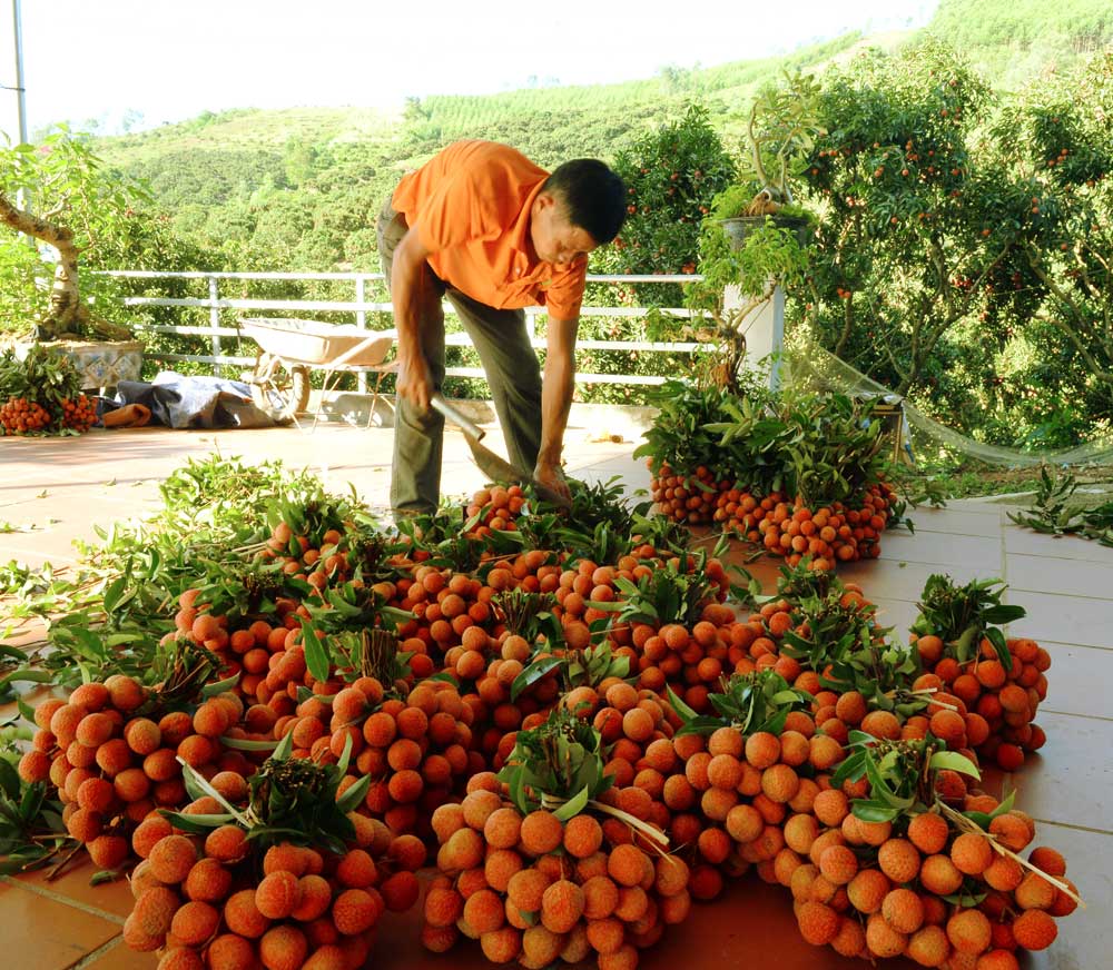 Trời sáng là lúc ông Hùng bê từng chùm vải xuống núi.
