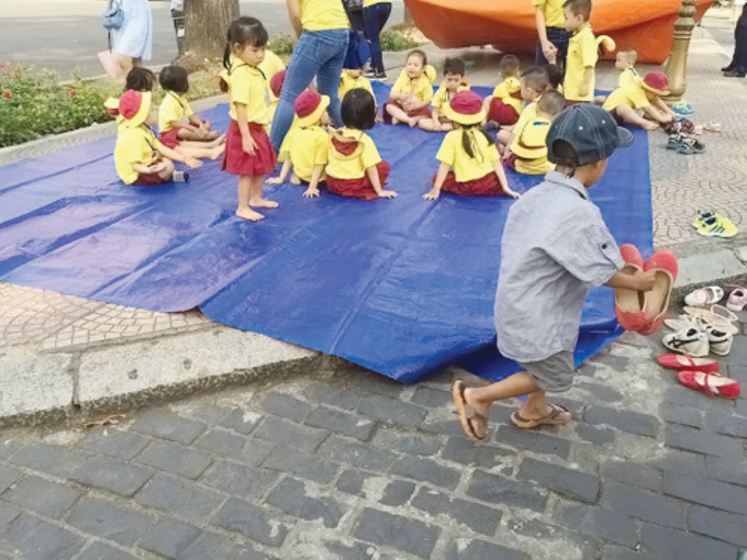 Tấm ảnh cậu bé xếp dép làm thay đổi cuộc sống của Đạt và người mẹ nhặt ve chai ở Sài Gòn. Ảnh: Nghĩa Phạm.