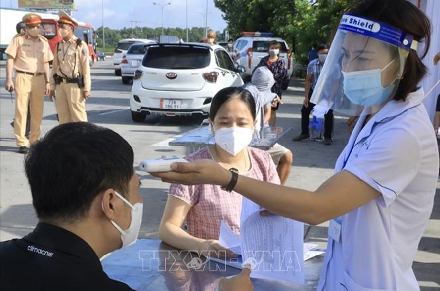 Kiểm tra thân nhiệt tại một chốt kiểm soát dịch ở Hà Nội. Ảnh: TTXVN.