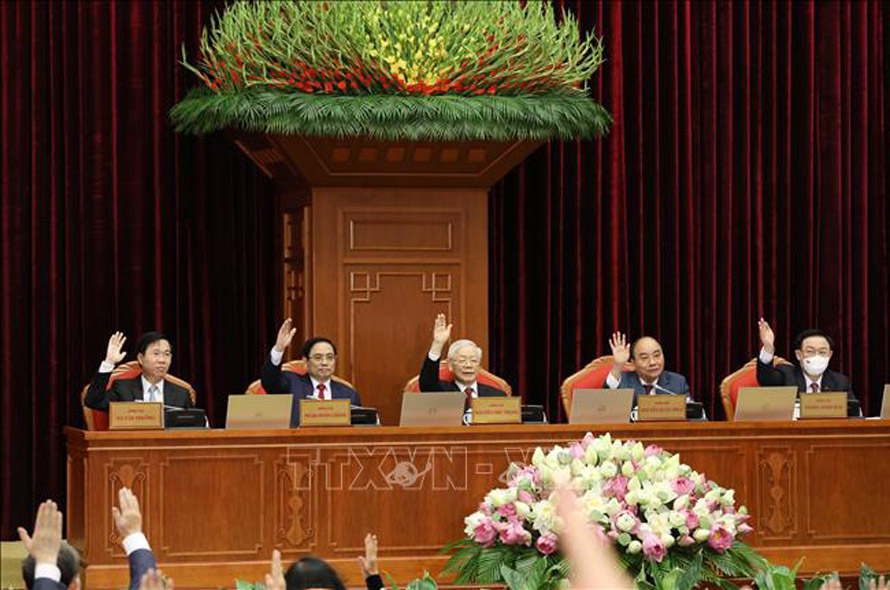 Các đồng chí lãnh đạo Đảng, Nhà nước biểu quyết thông qua chương trình Hội nghị lần thứ ba Ban Chấp hành Trung ương Đảng Cộng sản Việt Nam khóa XIII. Ảnh: Phương Hoa/TTXVN