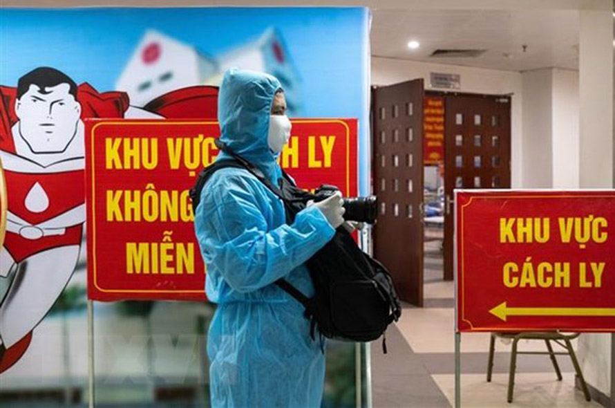 Phóng viên TTXVN tác nghiệp trong khu cách ly của Viện Huyết học Truyền máu Trung ương. Ảnh: TTXVN