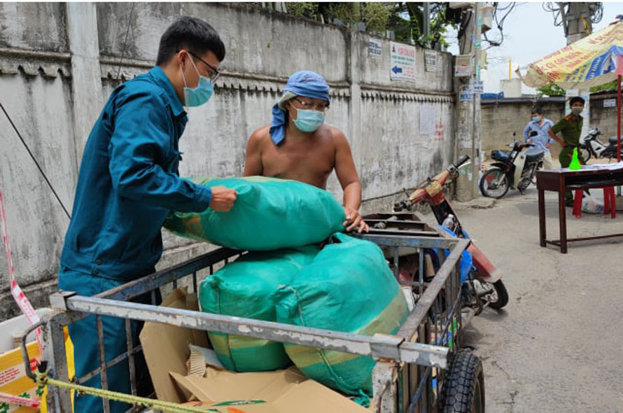 Có những bạn trẻ, là cư dân khu phong tỏa, tình nguyện mỗi ngày đi nhận cơm, suất ăn, nhu yếu phẩm của các nhà hảo tâm mang đến đầu hẻm, chở đi phát từng nhà trong hẻm. Các bạn trẻ đó tình nguyện làm người vận chuyển, để giúp nhiều bà con lối xóm có cái ăn mỗi bữa, không quá lo lắng khi không được ra ngoài đi chợ, đi làm như mọi khi.