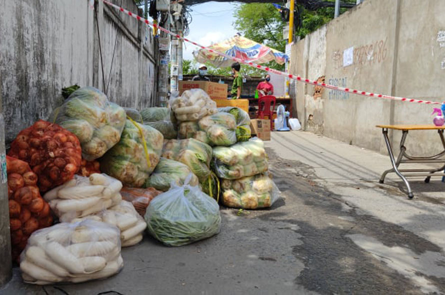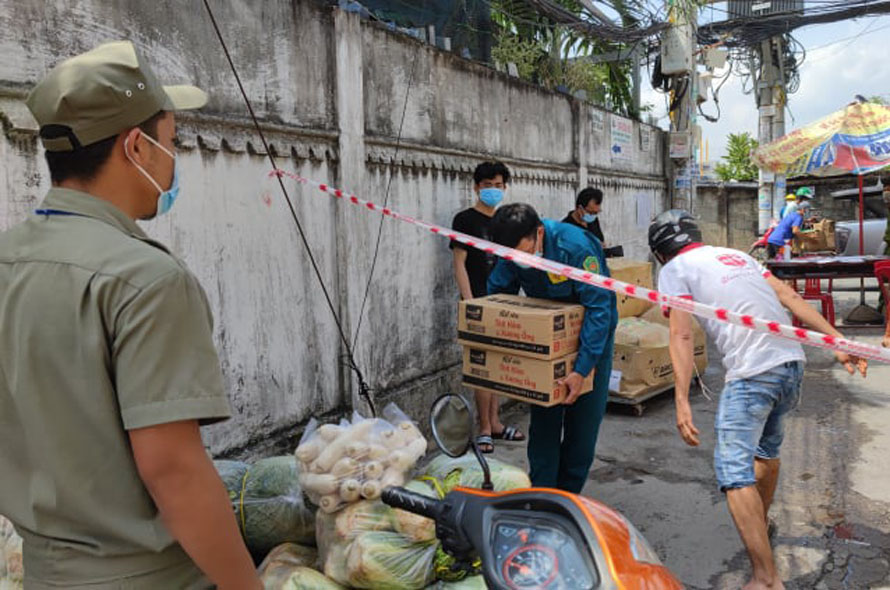 Sáng sớm 13.7, con hẻm vẫn trong diện phong tỏa, các khu trọ vẫn còn giăng dây phòng dịch, nhưng hàng hóa, nhu yếu phẩm tiếp tế dồn về rất nhiều. Nhiều nhóm từ thiện, cá nhân, công ty... chở rau củ quả tươi, gạo, nước mắm, nước tương, muối trộn... tới tặng. Nhiều nhà hảo tâm còn tỉ mỉ chia ra những phần nhỏ sẵn để dễ phát cho bà con.