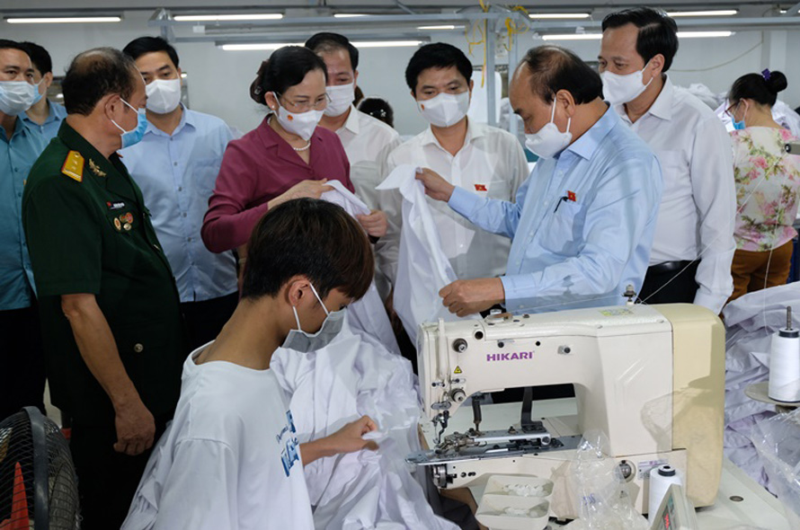 Ngày 23/7, Chủ tịch nước Nguyễn Xuân Phúc đến thăm doanh nghiệp may mặc Hoàng Tuyên tại tỉnh Hà Nam, do thương binh làm kinh tế giỏi Hoàng Văn Tuyên làm chủ. (Ảnh: Đào Phương)