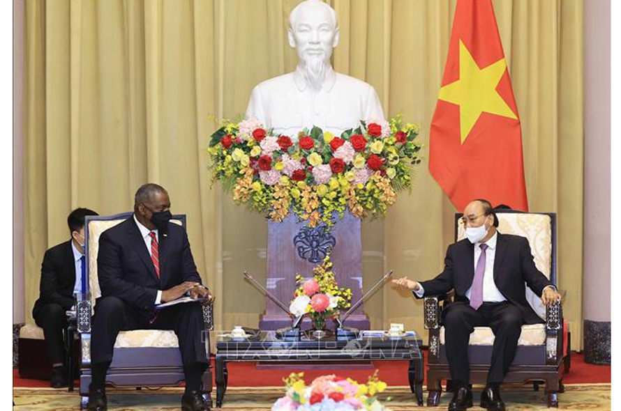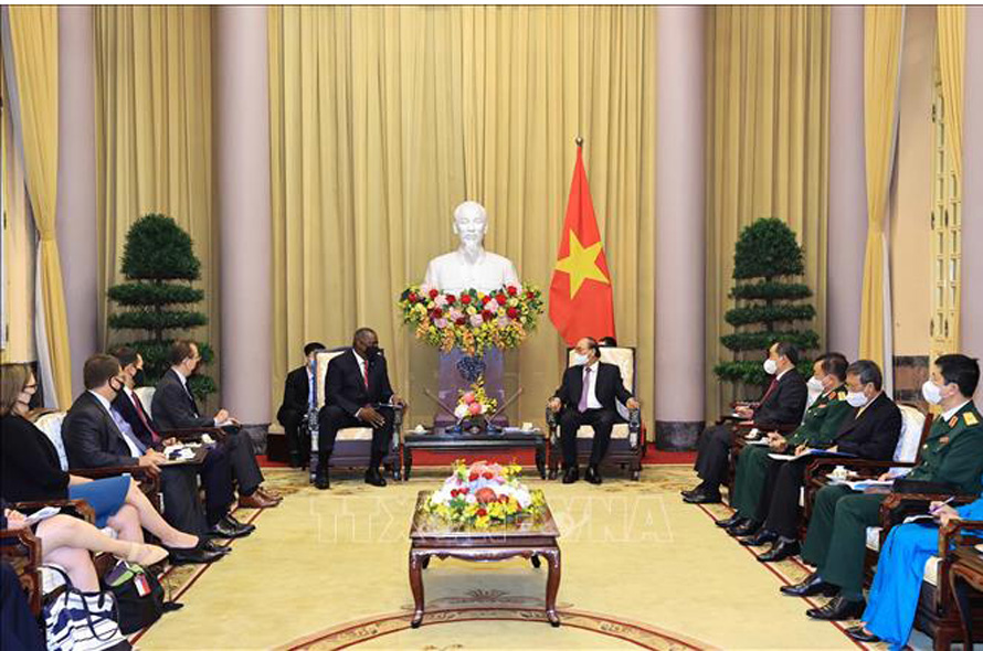 Chủ tịch nước Nguyễn Xuân Phúc tiếp Bộ trưởng Quốc phòng Hợp chúng quốc Hoa Kỳ Lloyd Austin. Ảnh: Thống Nhất/TTXVN