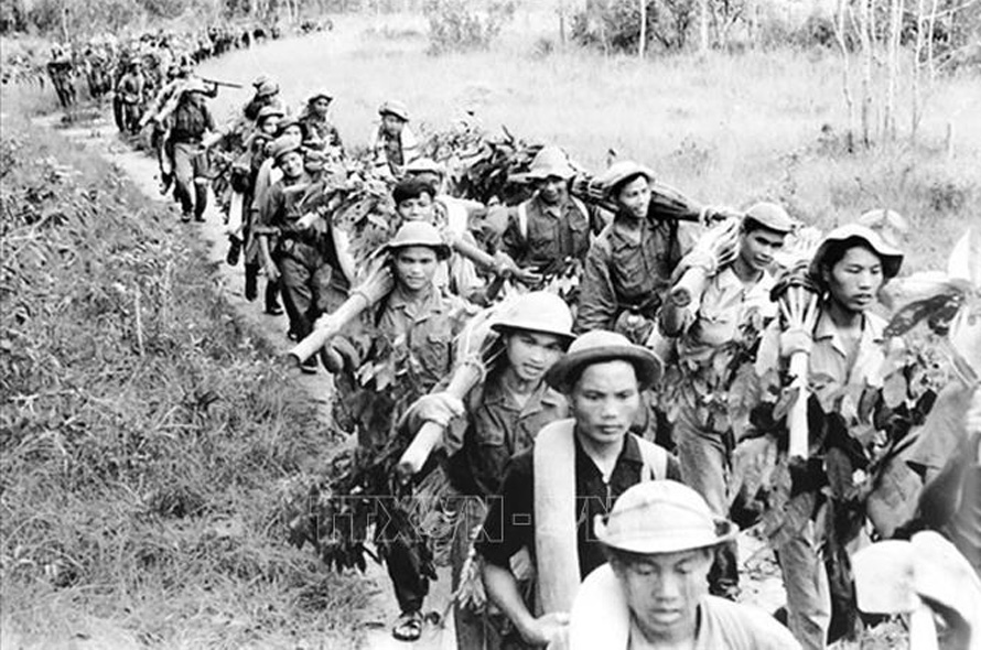 Ở miền Nam, công tác tuyên giáo đã cổ vũ quần chúng đẩy mạnh đấu tranh chính trị và đấu tranh vũ trang ở khắp mọi nơi, bồi dưỡng lòng yêu nước, tinh thần dũng cảm, không quản ngại hy sinh, tạo nên nhiều phong trào thi đua giết giặc, lập công. Trong ảnh: Quân giải phóng miền Đông Nam bộ hành quân trong Chiến dịch Đông Xuân năm 1964 – 1965. Ảnh: Tư liệu/TTXVN phát