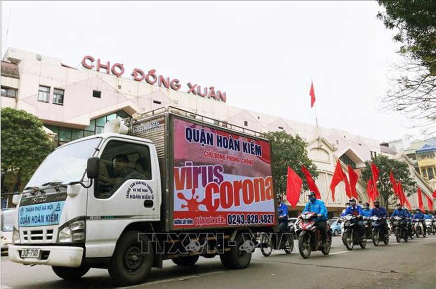 Đoàn xe lưu động tuyên truyền phòng, chống dịch COVID-19 bên ngoài chợ Đồng Xuân (Hà Nội). Ảnh: Lâm Khánh/TTXVN