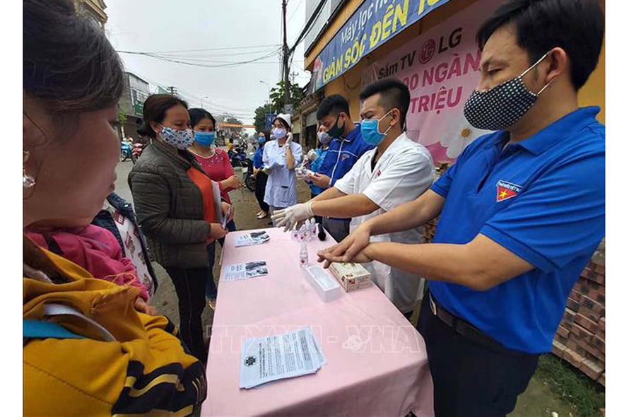 Đoàn viên, thanh niên tỉnh Thanh Hóa tuyên truyền hướng dẫn người dân phòng, chống dịch bệnh COVID-19 tại các khu dân cư. Ảnh: Nguyễn Nam/TTXVN