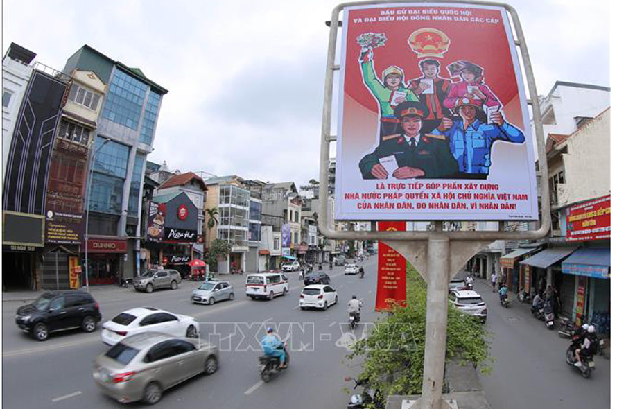 Công tác tuyên truyền là một trong những yếu tố có tính chất quyết định cho thành công của cuộc bầu cử đại biểu Quốc hội khóa XV và đại biểu HĐND các cấp, nhiệm kỳ 2021 - 2026. Trong ảnh: Pano tuyên truyền, cổ động bầu cử trên phố Nghi Tàm (Hà Nội). Ảnh: Hoàng Hiếu/TTXVN