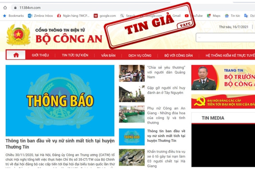 Website www.11384vn.com giả mạo Cổng thông tin Bộ Công an. Ảnh: tingia.gov.vn.