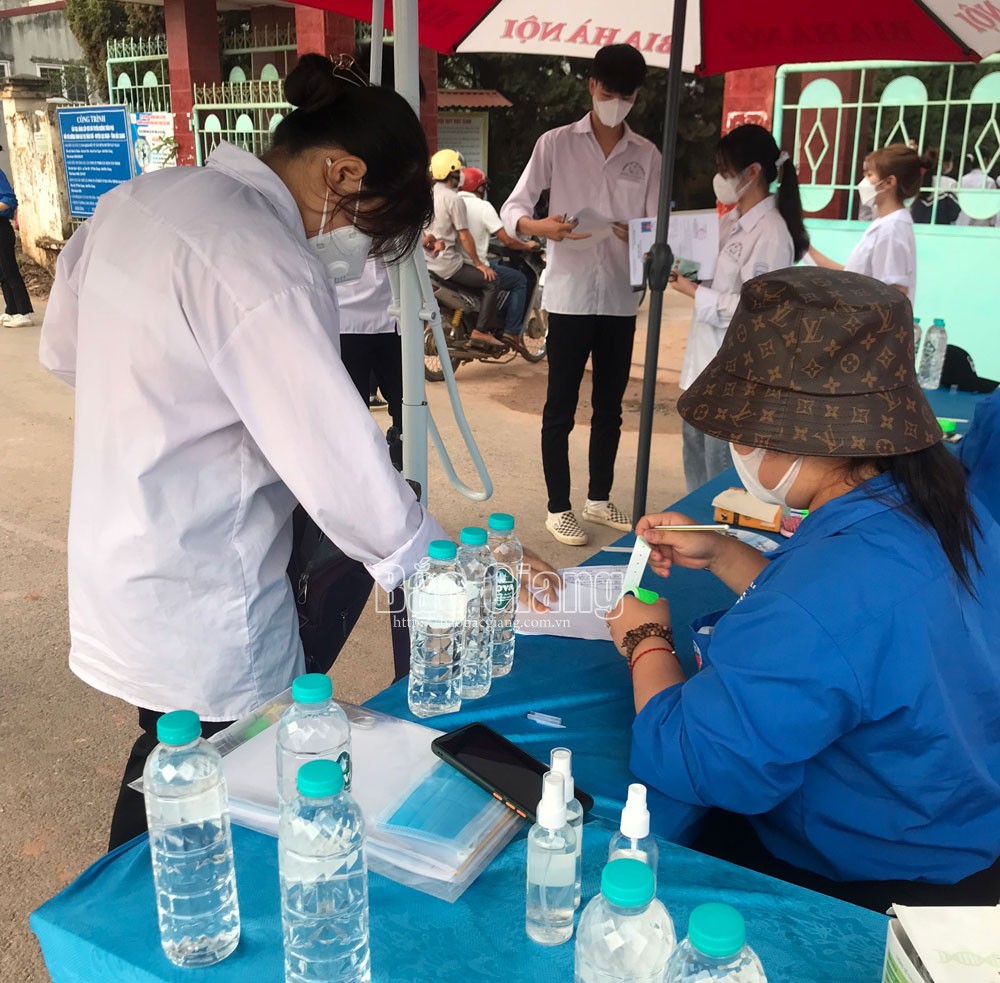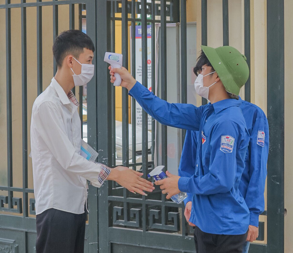 Thanh niên tình nguyện kiểm tra thân nhiệt, sát khuẩn tay cho thí sinh tại điểm thi Trường THPT Tân Yên số 1.