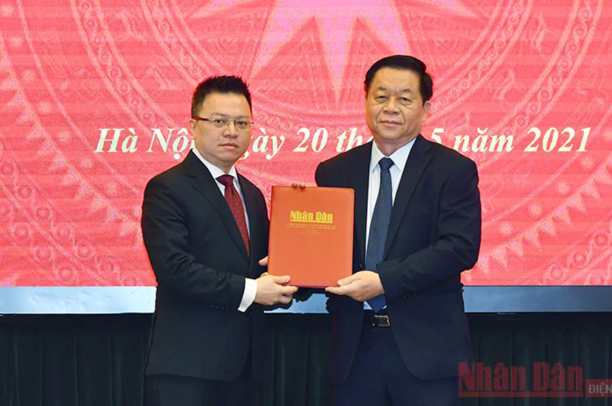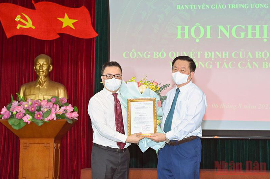 Trưởng Ban Tuyên giáo Trung ương Nguyễn Trọng Nghĩa trao Quyết định của Bộ Chính trị phân công đồng chí Lê Quốc Minh giữ chức vụ Tổng Biên tập Báo Nhân Dân. (Ảnh: Duy Linh)