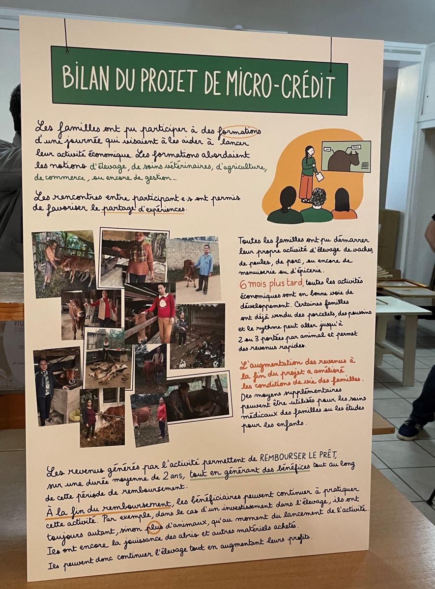 Họa sĩ Trâm Anh bên tranh đồ họa giới thiệu dự án tín dụng nhỏ giúp đỡ các gia đình nạn nhân da cam ở Việt Nam.