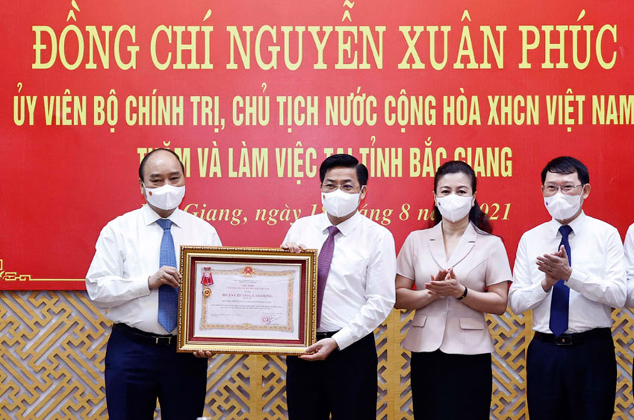 Sáng 18/8, Chủ tịch nước Nguyễn Xuân Phúc đã thăm, làm việc tại Bắc Giang và trao Huân chương Lao động hạng Ba tặng Đảng bộ, chính quyền và nhân dân tỉnh. Bắc Giang cũng là địa phương đầu tiên của cả nước được Chủ tịch nước tặng thưởng về thành tích trong công tác phòng, chống dịch Covid-19.