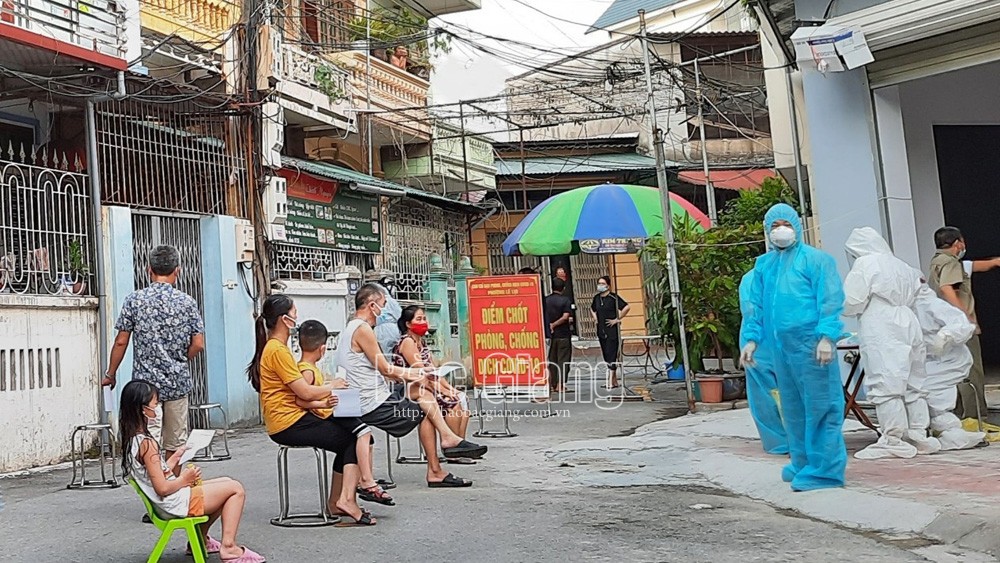Lực lượng chức năng lấy mẫu xét nghiệm tại tổ dân phố Đồng Cửa, phường Lê Lợi (TP Bắc Giang).