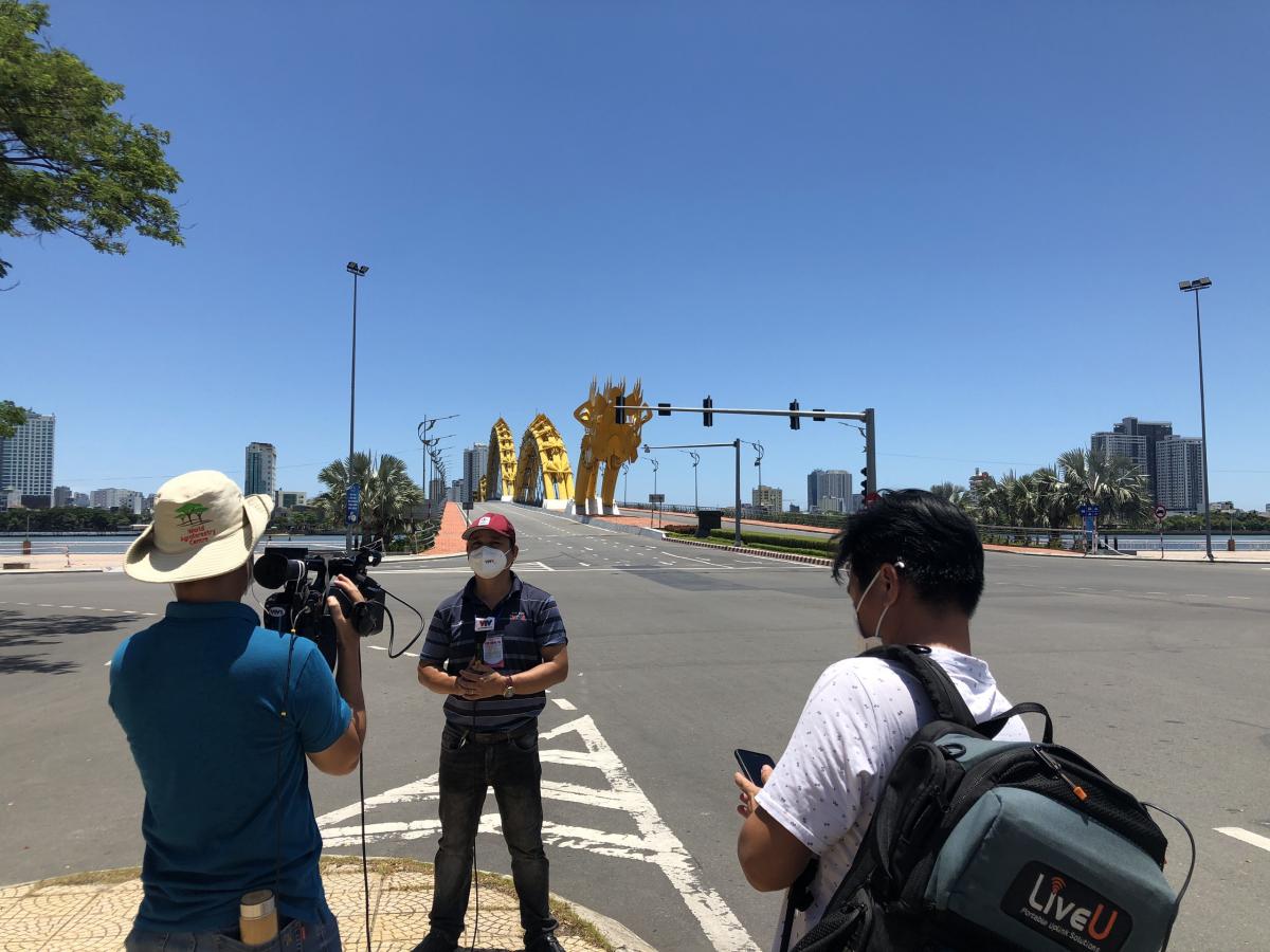 Ê kíp tường thuật trực tiếp bản tin trưa của đài VTV8 đang tác nghiệp tại nút giao thông phía Tây cầu Rồng trong những ngày Đà Nẵng thực hiện “ai ở đâu ở yên đó“. Ảnh: Xuân Quỳnh