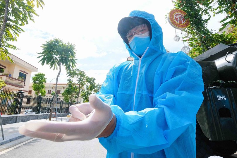 Nhà báo Hoàng Mạnh Thắng - Báo Tiền Phong mặc kín mít tác nghiệp tại ngõ 68, phố Đội Cấn, khi một đoạn phố Đội Cấn, quận Ba Đình, Hà Nội bị phong tỏa vì liên quan 16 ca COVID-19. Ảnh: NVCC