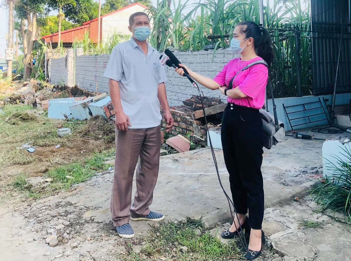 Tại tỉnh miền núi Yến Bái, dù qua nhiều ngày không có ca nhiễm trong cộng đồng nhưng đội ngũ phóng viên vẫn luôn giữ thói quen phòng dịch. Trong ảnh, nhà báo Thu Trang - Báo Yên Bái đang phỏng vấn người dân về phòng chống dịch. Ảnh: NVCC