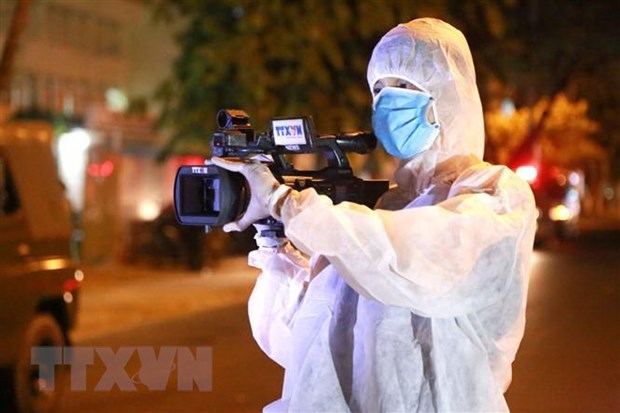 Phóng viên tác nghiệp tại khu cách ly. (Nguồn: TTXVN)
