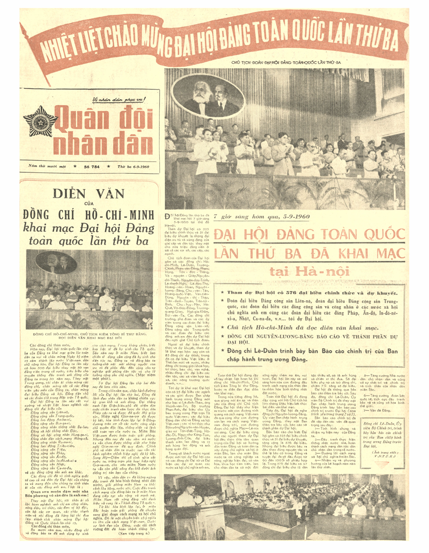 Ngày 6-9-1960, trang nhất Báo Quân đội nhân dân đăng "Diễn văn của Đồng chí Hồ Chí Minh khai mạc Đại hội Đảng toàn quốc lần thứ ba".