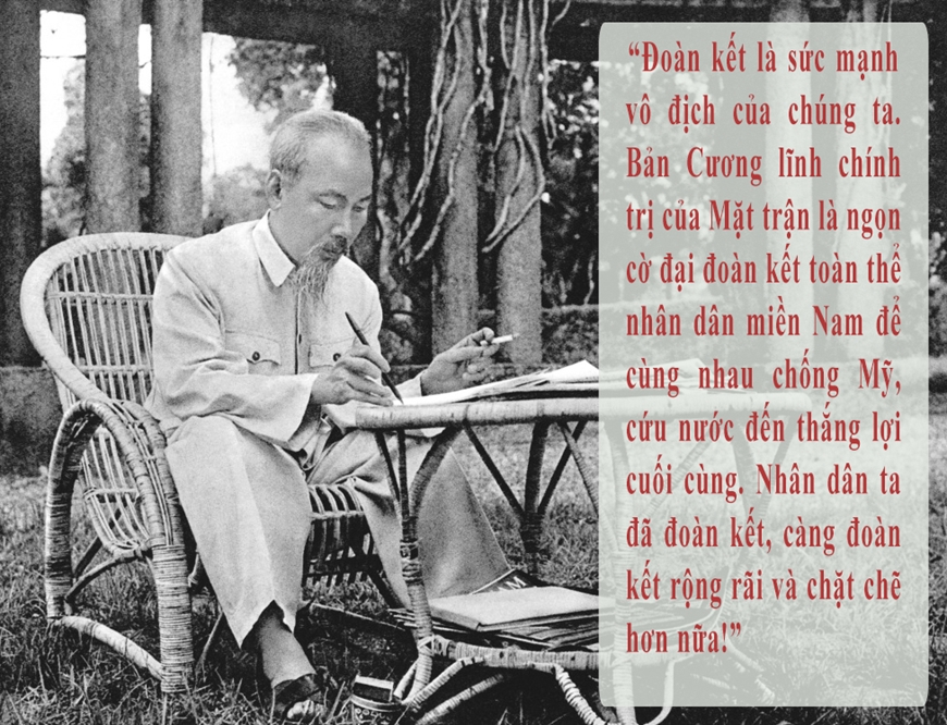 “Đoàn kết là sức mạnh vô địch của chúng ta. Bản Cương lĩnh chính trị của Mặt trận là ngọn cờ đại đoàn kết toàn thể nhân dân miền Nam để cùng nhau chống Mỹ, cứu nước đến thắng lợi cuối cùng. Nhân dân ta đã đoàn kết, càng đoàn kết rộng rãi và chặt chẽ hơn nữa!”. (Hồ Chí Minh toàn tập, NXB Chính trị quốc gia - Sự thật, 2011)