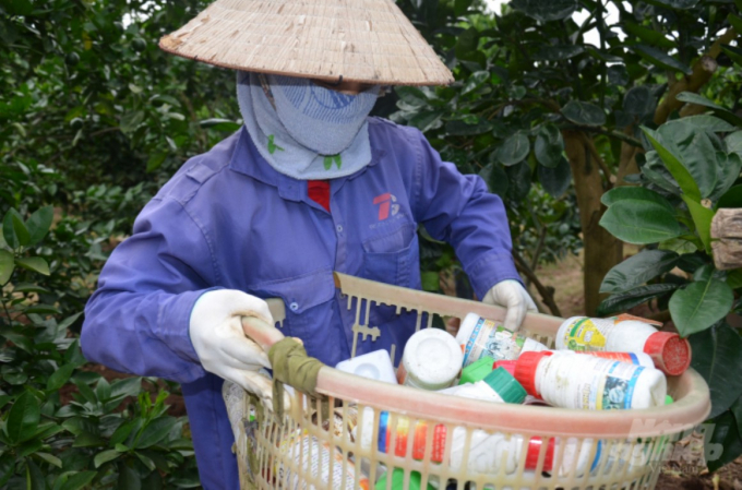Một chủ vườn ở huyện Lục Ngạn, tỉnh Bắc Giang đang khệ nệ bê rổ vỏ thuốc BVTV dùng trong mấy tháng. Ảnh NNVN