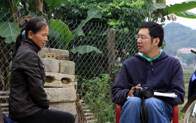 Nhà báo Dương Đình Tường trong một cuộc phỏng vấn với người dân. Ảnh NVCC