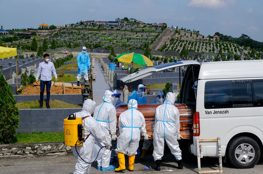 Một nạn nhân tử vong vì COVID-19 được đưa đi an táng tại nghĩa trang Fairy Park, vùng, Meru, bang Selangor, Malaysia. Ảnh: Bloomberg