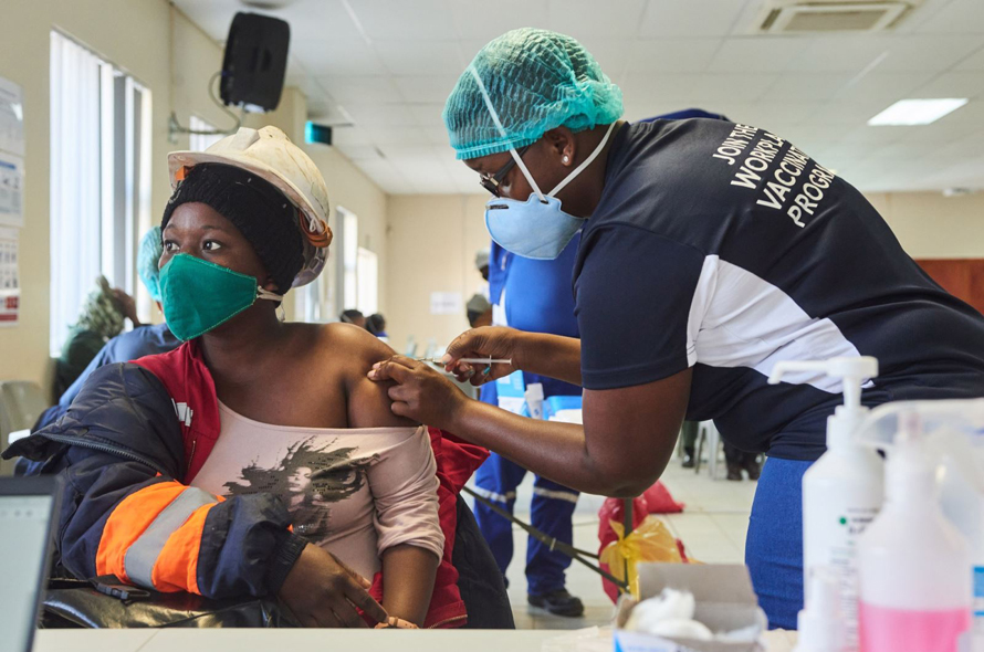 Một thợ mỏ được tiêm chủng vaccine ở Amandelbult, Nam Phi. Ảnh: Bloomberg