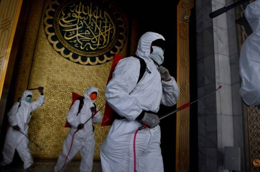 Khử trùng môt thánh đường ở TP Surabaya, tỉnh Đông Java trong nỗ lực ngăn chặn Covid-19 lây lan. (Ảnh: REUTERS)