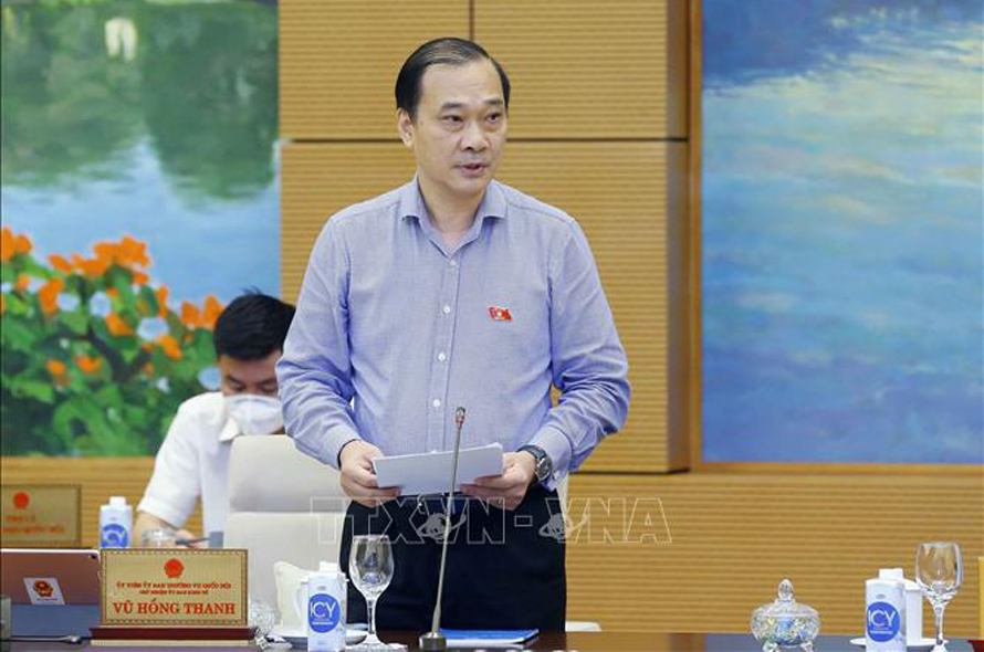 Chủ nhiệm Ủy ban Kinh tế của Quốc hội Vũ Hồng Thanh, Phó Trưởng đoàn Thường trực Đoàn giám sát trình bày các văn bản liên quan. Ảnh: Doãn Tấn/TTXVN