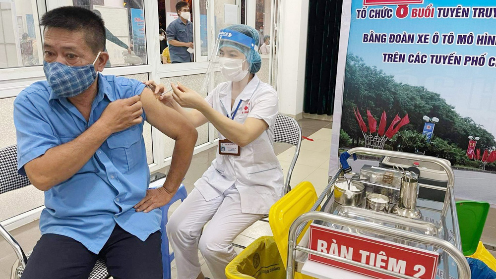 Nhân viên y tế tỉnh Bắc Giang tiêm vắc-vắc xin cho người dân tại quận Long Biên. Ảnh Thu Trang. |