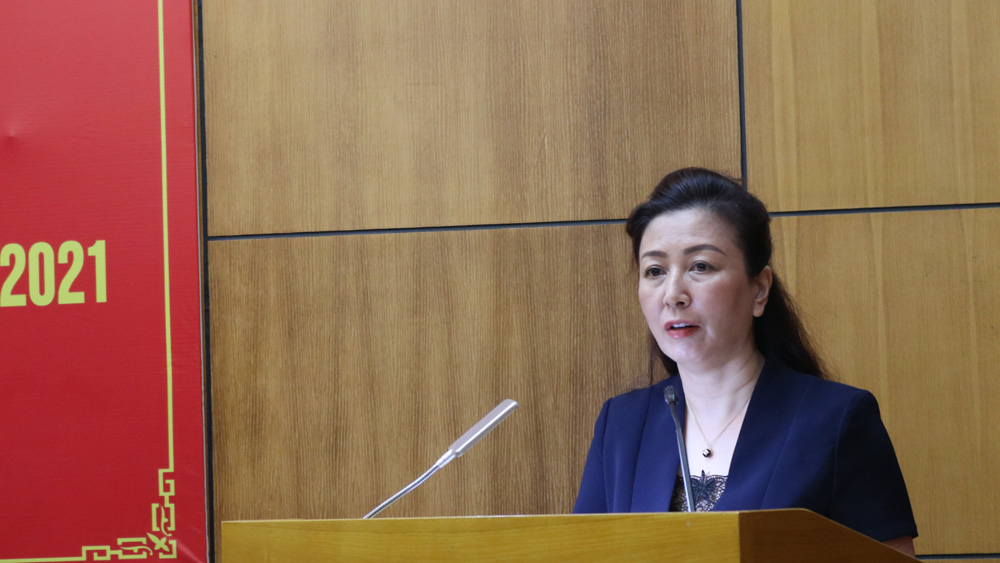 Đồng chí Lê Thị Thu Hồng trình bày báo cáo kết quả công tác 9 tháng đầu năm, nhiệm vụ trọng tâm thời gian tới. |