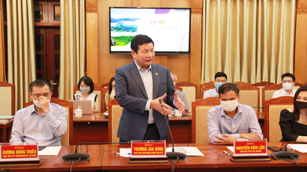 Ông Trương Gia Bình bày tỏ sự ấn tượng trước thành quả của Bắc Giang trong phát triển CNTT cũng như ứng dụng để phòng, chống dịch Covid-19 và thực hiện các nhiệm vụ KT-XH, tạo nên sức hút to lớn đối với các tập đoàn, doanh nghiệp trong và ngoài nước. Theo ông Bình, FPT là một trong những công ty dịch vụ CNTT lớn nhất tại Việt Nam. FPT luôn không ngừng đổi mới, liên tục sáng tạo với mong muốn đem đến cho khách hàng các sản phẩm, giải pháp, dịch vụ công nghệ tối ưu nhất.