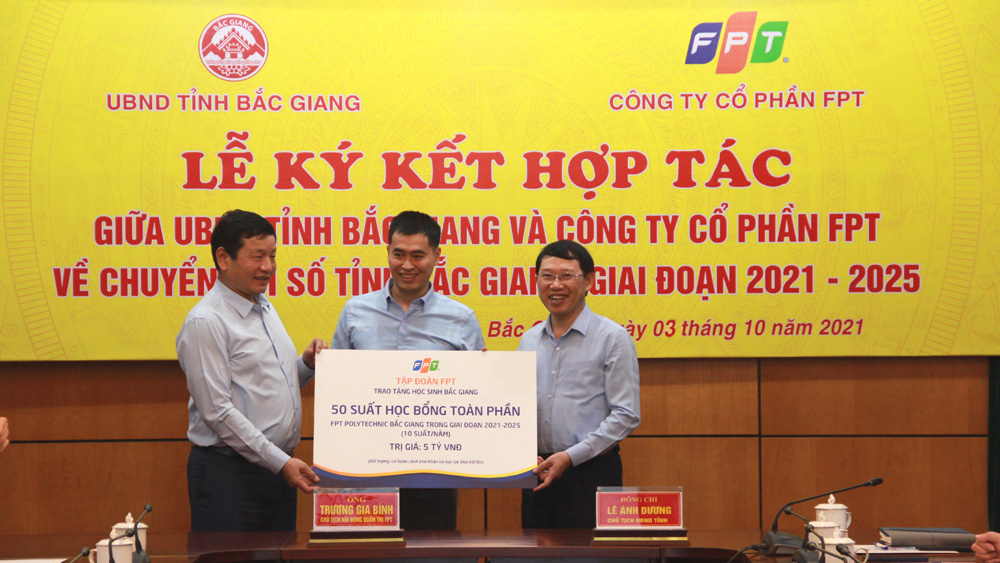 Nhân dịp này, FPT trao 50 suất học bổng trị giá 5 tỷ đồng theo học các chương trình đào tạo nhân lực chất lượng cao “Thực học – Thực nghiệp” tại Trường Cao đẳng FPT Polytechnic cho học sinh Bắc Giang.