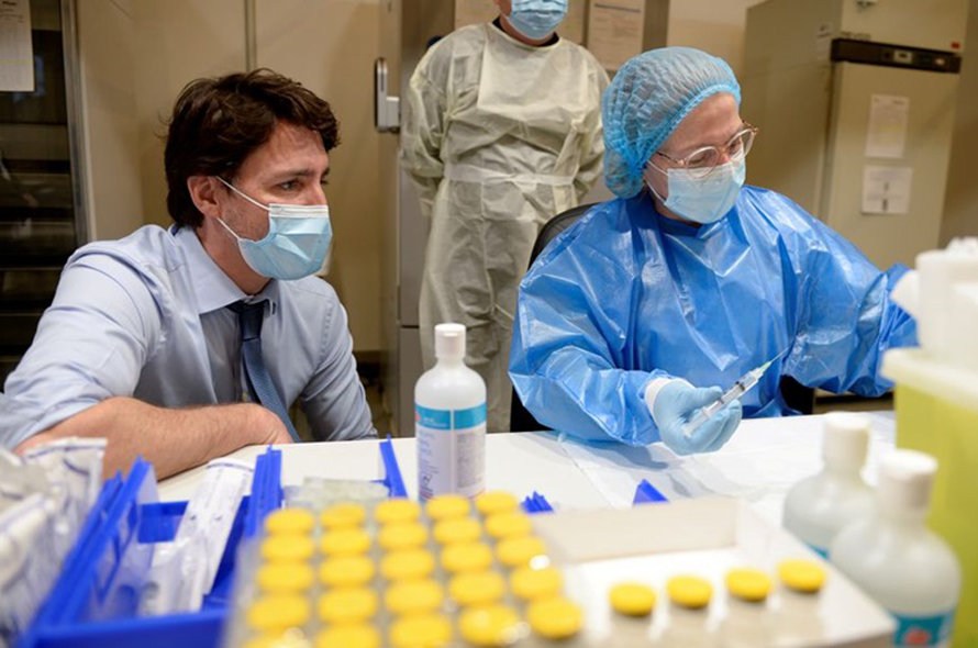 Thủ tướng J.Trudeau quan sát quy trình chiết vaccine của Pfizer-BioNTech tại một trung tâm vaccine ở Palais des Congres, ngày 15/3. (Ảnh: Reuters)