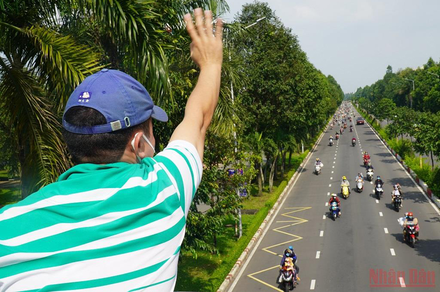 Tác giả vẫy tay chào anh chị em công nhân từ Đồng Nai về quê các tỉnh Tây Nguyên. (Ảnh Phước Tuấn).