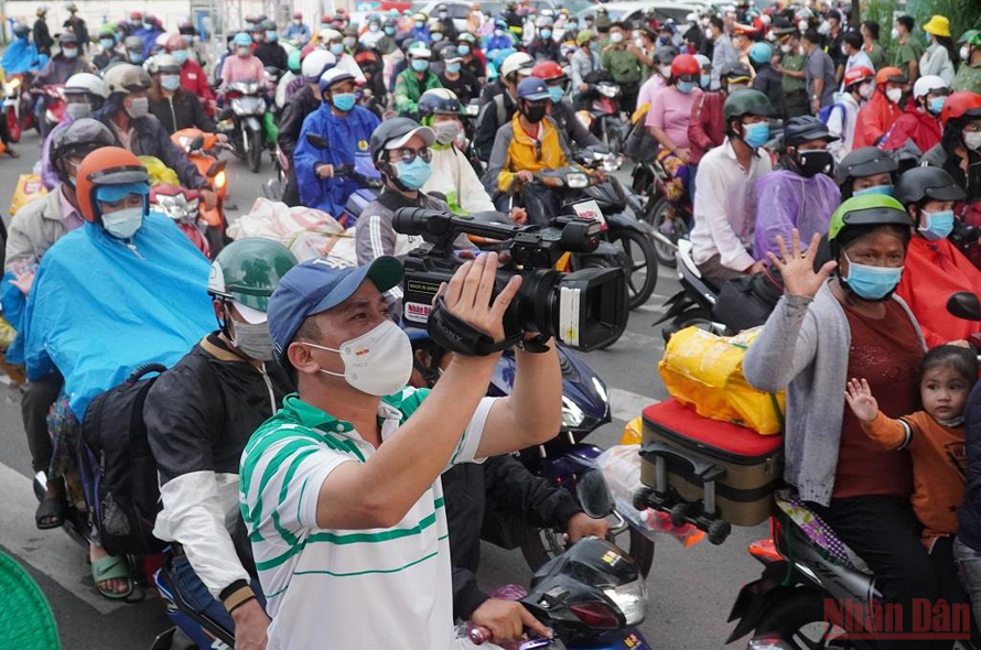 Tác giả tác nghiệp giữa dòng người về quê các tỉnh miền tây chiều 5/10. (Ảnh Phước Tuấn).