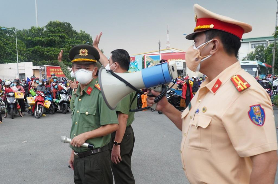 Lực lượng Công an tỉnh Đồng Nai hướng dẫn người dân đi theo xe dẫn đoàn trước lúc xuất phát.
