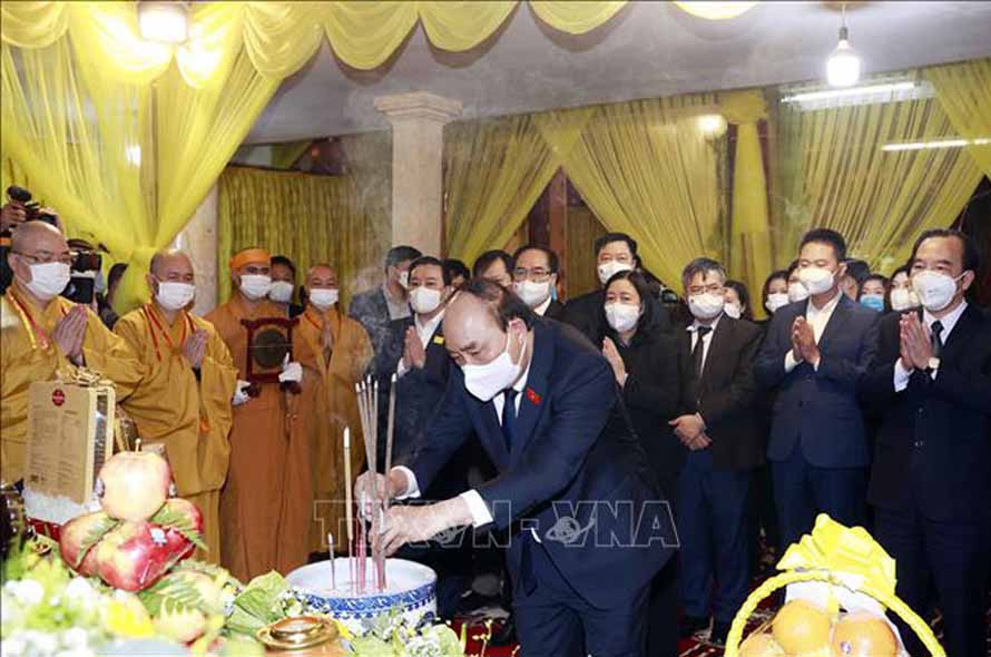 Chủ tịch nước Nguyễn Xuân Phúc viếng Đại lão Hòa thượng Thích Phổ Tuệ. (Ảnh: TTXVN)