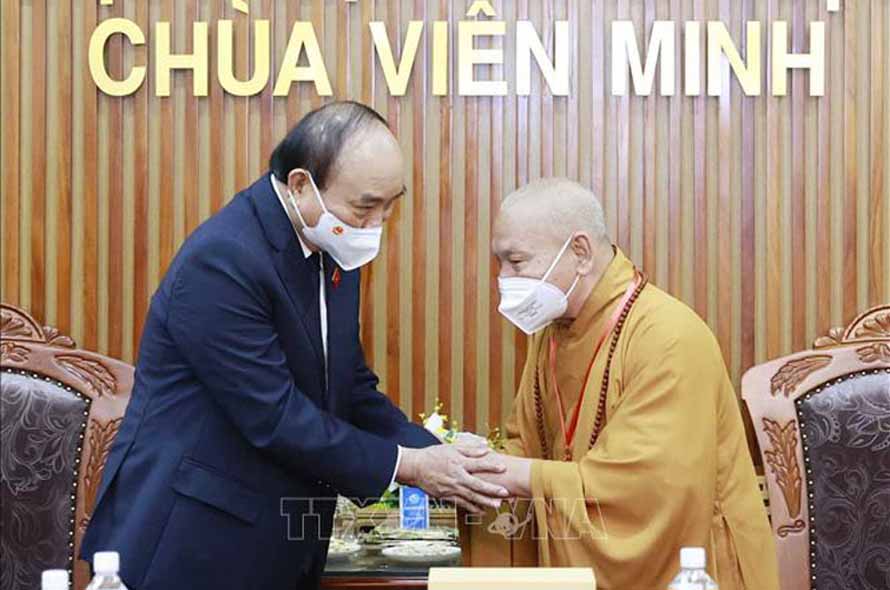 Chủ tịch nước Nguyễn Xuân Phúc chia buồn với lãnh đạo Giáo hội Phật giáo Việt Nam. (Ảnh: TTXVN)