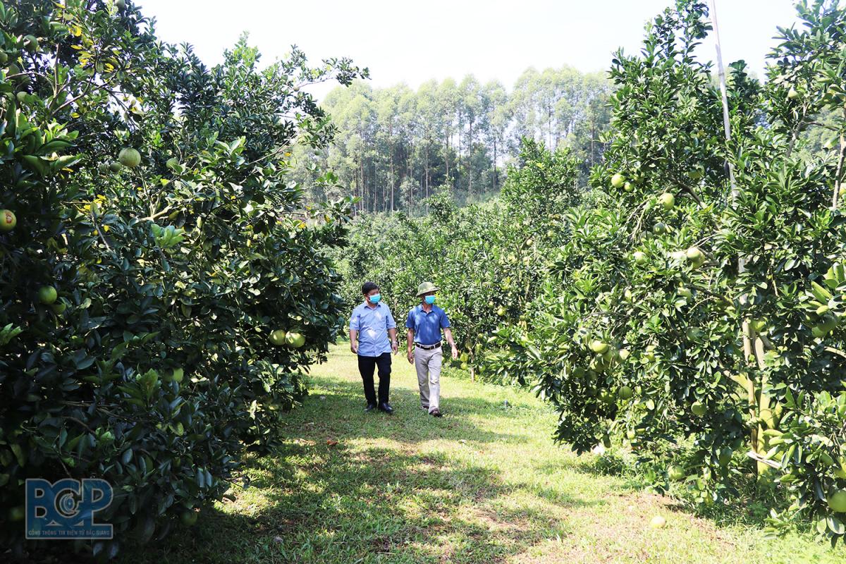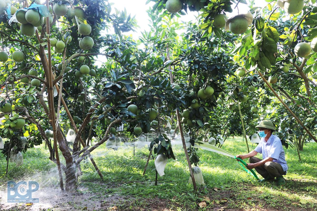Gia đình ông Trần Đình Én, thôn Tân Trường, xã Thanh Hải, Lục Ngạn chăm sóc vườn bưởi sản xuất hữu cơ.
